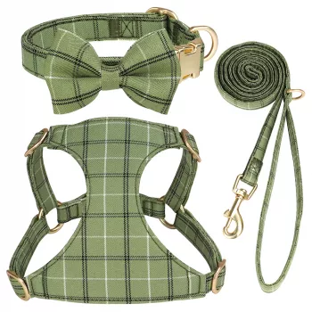 3pcs Plaid Bowtie Dog Collar Harness Leash Set – Adjustable & Festive Pet Outfit